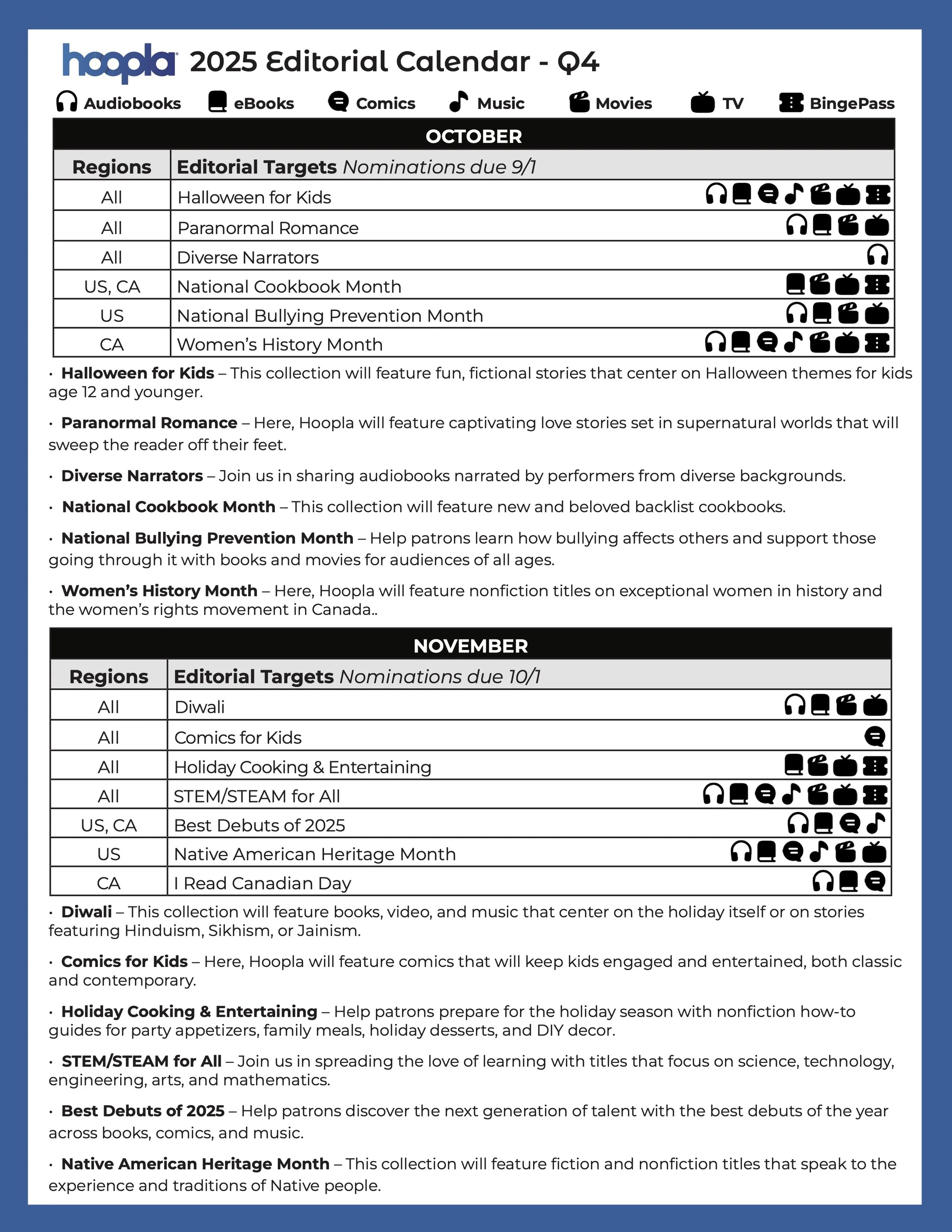 All assets can be found on the hoopla Resource Center website. These are provided for libraries to promote content, events, and hoopla throughout the year.